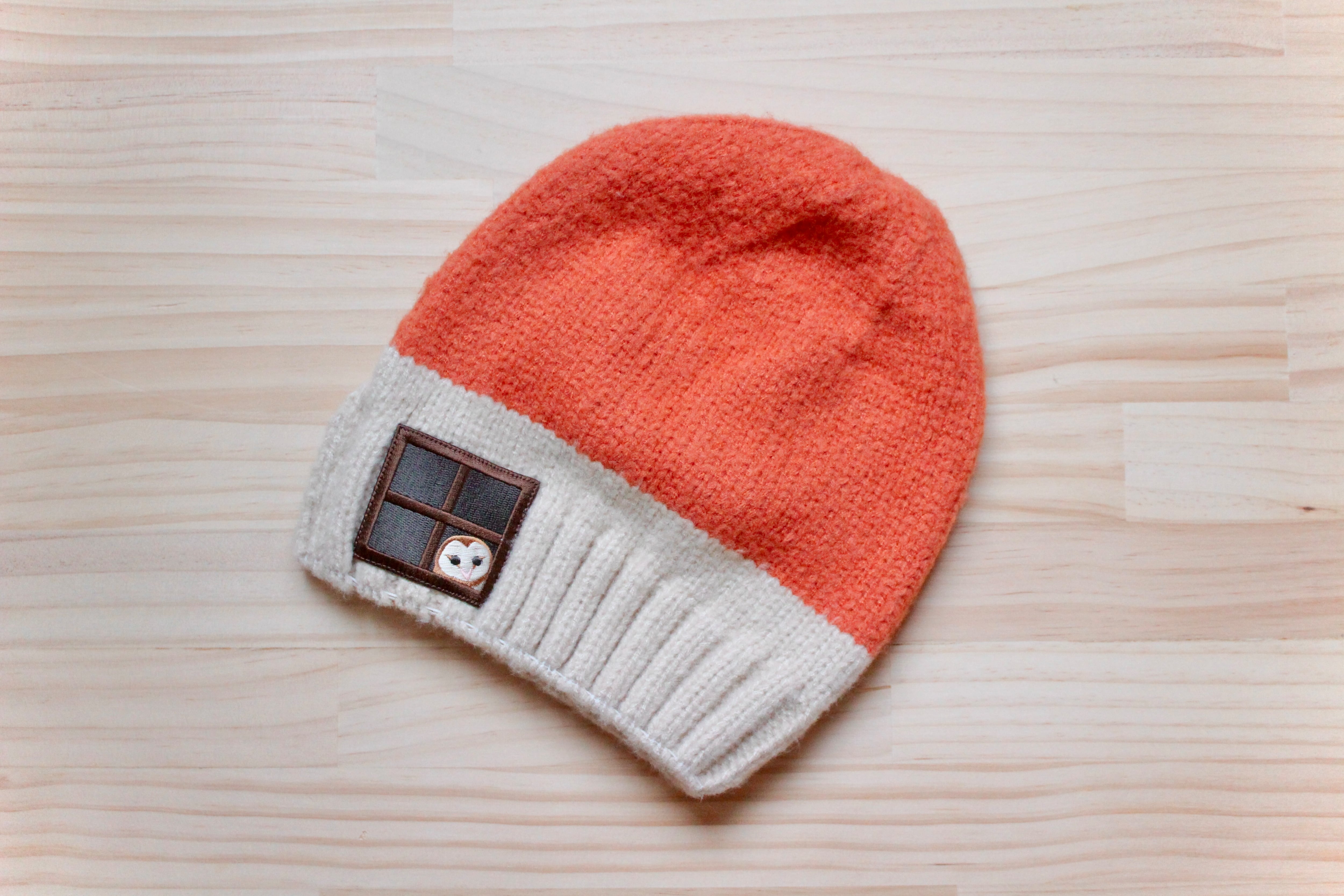 バイカラーのニット帽の切替えを屋根に見立て、小窓から顔を覗かせる納屋棲みのメンフクロウを刺繍ワッペンであしらいました。外国の農家の納屋のイメージで選んだカラーも可愛い自信作です。